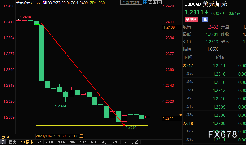 北京时间周三(10月27日)22:00,加拿大央行结束量化宽松,转在投资,并提升预期加息步伐。截至发稿,美元兑加元重挫近110个点至1.2301。