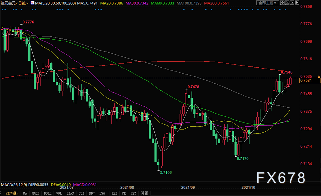 周三(10月27日),澳元兑美元连续第三个交易日上涨,一度刷新本周高点。日内公布的澳洲CPI与季度预估相符,但澳洲联储修正后的平均CPI偏向多头。市场情绪依然喜忧参半,澳元兑美元在盘中高点0.7536附近仍有良好买盘,然而在美国第三季GDP数据出炉前市场可能会避免大举押注。
