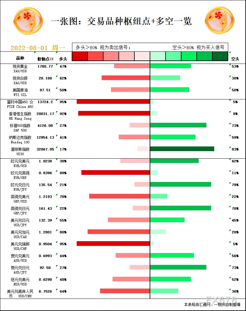 一张图:8月1日黄金白银、原油、股指、外汇“枢纽点+多空信号”;周一(8月1日)一张图看“枢纽点+多空信号”,品种包括:黄金、白银、原油、股指、欧元、英镑、日元、澳元、纽元、加元、富时中国A50、恒生指数、道指、标普500等。美元跌跌不休,多数分析师看涨黄金后市,本周还迎非农和美联储官员讲话考验