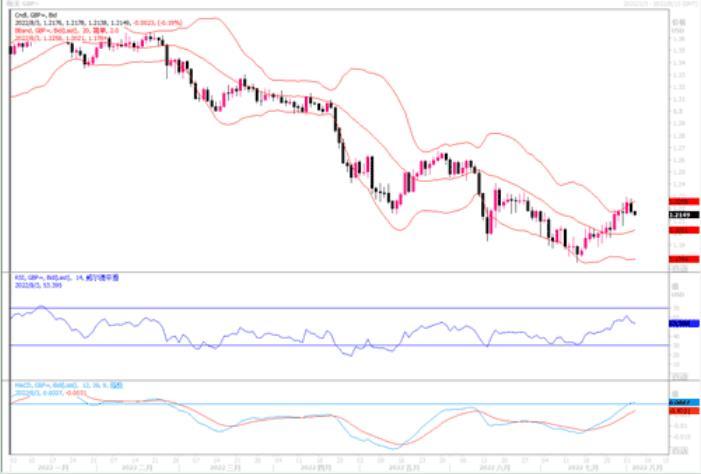 英镑兑美元周二走软,中美紧张关系因台湾问题升温,交易员转向避险货币,另等候本周英国央行的政策会议。英国央行将在周四宣布其决定,投资者现在预计加息50个基点的可能性为95%,升息幅度比前四次更大,因为央行急于在经济没有急剧放缓的情况下遏制飙升的通胀。短期而言,如果英国央行周四选择加息25个基点,英镑将下跌。此外,周二美联储决策官员继续发表加息强硬讲话,刺激美元走升,也严重打压了英镑的反弹表现。在本周英央行议息会议、美国非农数据这两件大事件明晰之前,英镑兑美元恐暂时难以向上进行新的突破。目前4小时图上,英镑兑美元在1.23之前遭遇阻力,汇价进行高位获利回吐的调整,技术指标拐头向下,日内留意1.21整数关口的支撑,若跌破,下行幅度将进一步延展。