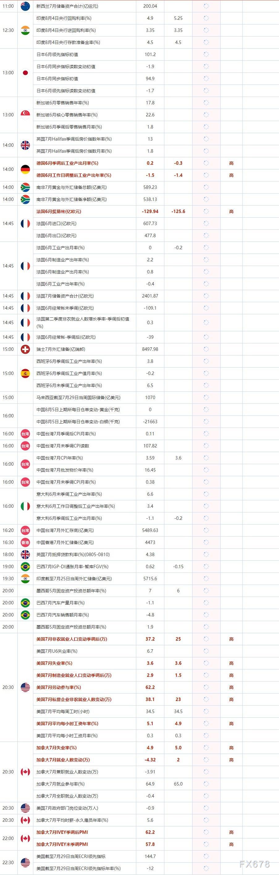 2022年8月5日,全球主要经济体将公布经济数据,需重点关注德国6月季调后工业产出月率,法国6月贸易帐,美国7月非农就业人口变动季调后,美国7月失业率,美国7月平均每小时工资年率,加拿大7月失业率和就业人数变动。大事方面需关注:澳洲联储公布货币政策声明,英国央行首席经济学家皮尔发表讲话,里士满联储主席巴尔金发表讲话。