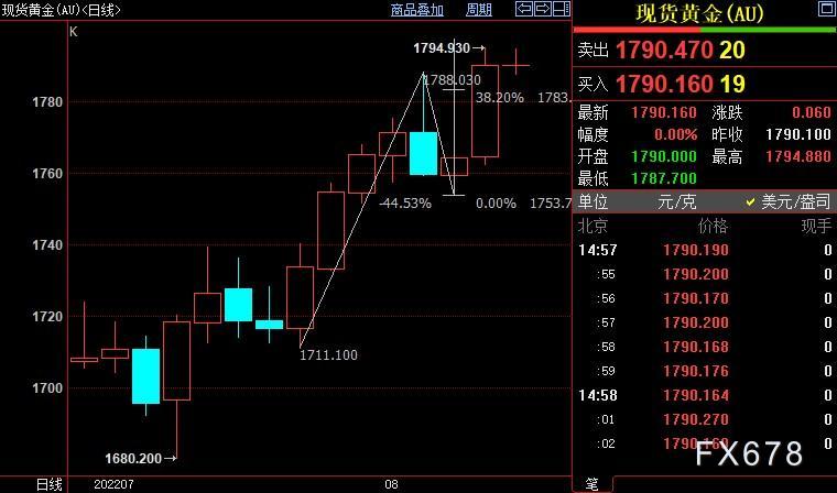 小时图上看,若金价升破并站上1800-1804美元区间,后市有望进一步上摸1812-1814美元区间;反之,金价料回测1774-1768美元一带支撑。
