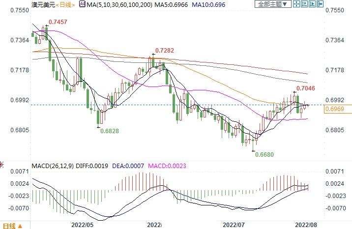 北京时间8月5日13:49,澳元兑美元报0.6969/71