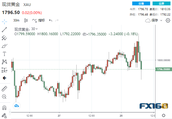 在美国经济数据公布后一度触及1810.35美元高点,为近一周以来首次,但随后又回落至1792.22低点。
