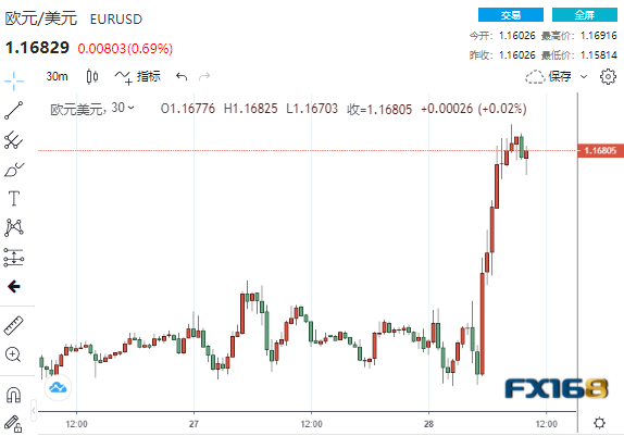 欧元/美元日内强势反弹,最高触及1.1692,创下近一个月高位,较日低大幅拉升110点。
