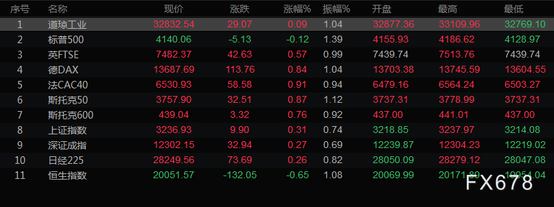 美股收盘情况,道琼斯工业指数上涨0.09%,至32832.54点;标普500指数下跌0.12%,至4140.06点;纳斯达克指数下跌0.1%,至12644.46点。