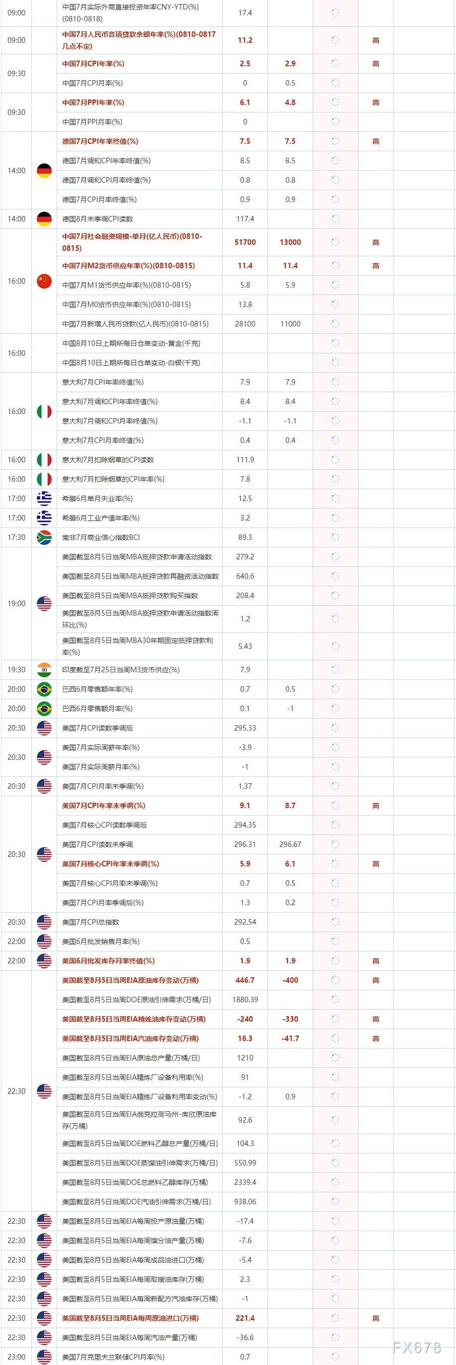2022年8月10日,全球主要经济体将公布经济数据,需重点关注中国7月人民币各项贷款余额年率,中国7月CPI年率,中国7月PPI年率,德国7月CPI年率终值,美国7月CPI年率未季调和美国6月批发库存月率终值。大事方面需关注:芝加哥联储主席埃文斯就美国经济和货币政策进行讨论。