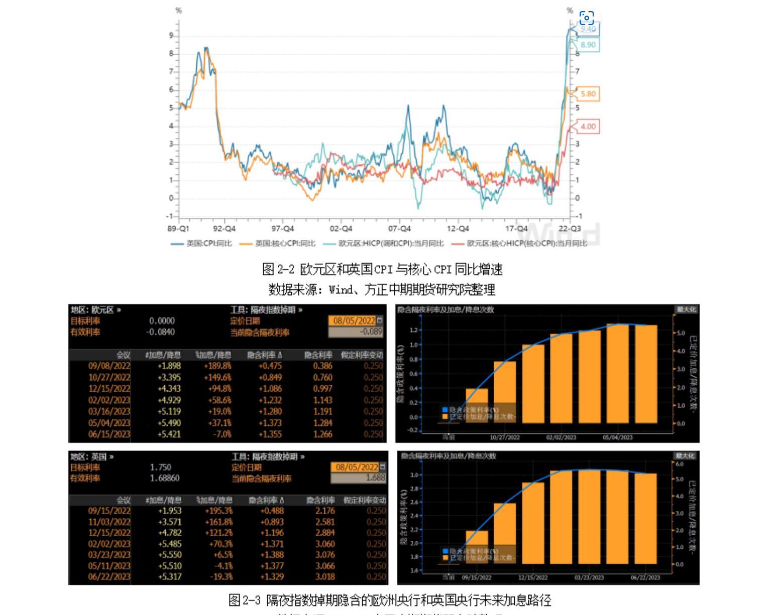 8月1日欧盟统计局公布欧元区7月HICP同比增速录得8.9%,续创该指数1997年1月发布以来历史新高;不过,边际增速大幅放缓,环比增速录得0.1%,创近1年以来新低。英国统计局在7月20日发布英国6月CPI同比增速录得9.4%,同样创该指数1989年1月发布以来新高;环比增速录得0.8%,略高于前值0.7%。通胀连创历史新高促使欧洲央行和英国央行加快货币货币收紧步伐。隔夜指数掉期显示欧洲央行和英国央行在今年未来三次议息会议将加息100-125BP,此轮加息要等到明年年中才会结束。