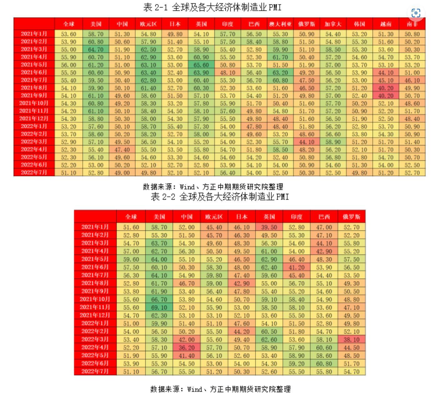 本周,全球主要经济体先后公布了7月PMI指数,整体来看制造业和服务业边际扩张速度正在不断趋缓,制造业更为明显。制造业方面,全球制造业PMI录得51.1,创近两年新低。其中,中国、欧元区、韩国跌破荣枯线,美国、日本、英国、巴西、澳大利亚、俄罗斯、加拿大、越南均低于前值,唯独印度和南非高于前值。印度制造业扩张势头十分良好,PMI录得56.4,是主要经济体中发展最快的。服务业方面,全球服务业PMI录得51.1,创近半年新低。主要经济体的PMI指数均高于荣枯线,全球已有77个国家解除与新冠疫情相关的所有入境限制,刺激了旅游、酒店、交运、零售等行业的扩张。