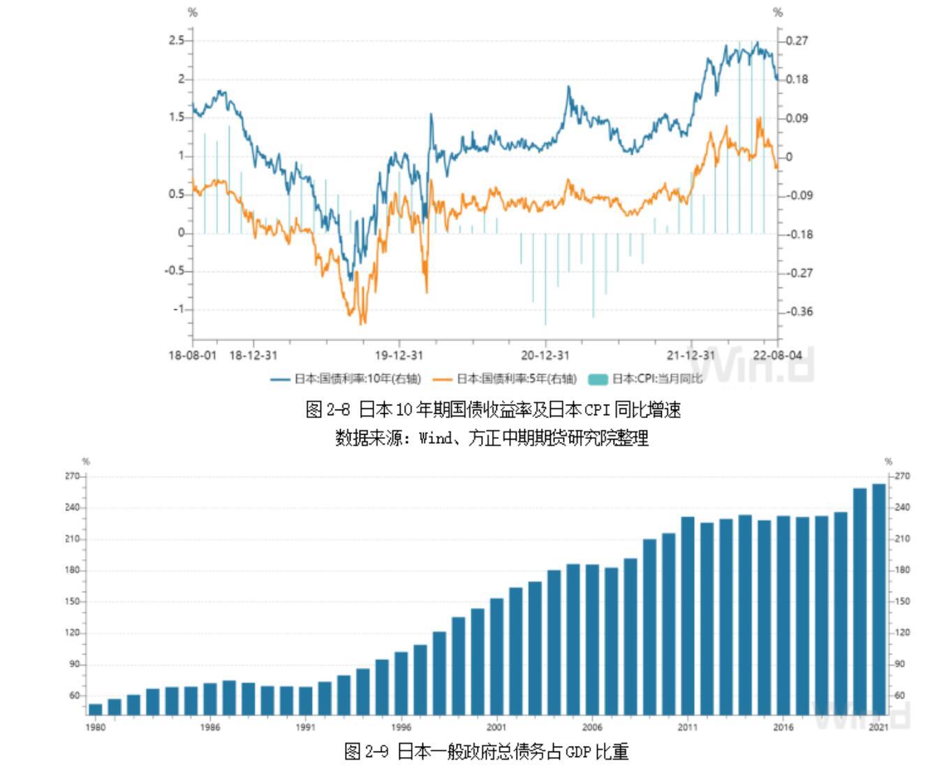 由于通胀高企,各大央行均采取货币收紧政策,促使本国国债收益率出现上升。日本是至今全球唯一坚持量化宽松政策的主要发达国家。从2021年9月起,日本结束9个月的通货紧缩,随后通胀水平持续攀升,连创阶段性新高。国际市场普遍认为在美联储持续加息+缩表的大背景下,日本也会转变当前宽松的货币政策。一旦收紧货币政策,日本国债收益率将会上升,日债市场价格下降。所以,大批国际投机资本大肆做空日本国债,希望赚取差价。在国际资本做空的压力下,日本国债收益率在2021年12月16日的0.054%出现拐点,随后大幅反转,2022年6月16日一度达到0.269%。期间,日本央行积极出手,多次宣布以固定利率无限量购入本国国债,试图将利率控制在0.25%大关,最近一次是在7月25号日本央行宣布将以固定利率无限额购买5000亿日元5-10年期国债。日本央行积极出手是为了控制日本债务规模,2021年日本一般政府总债务占GDP比重已经达到263.14%,一旦国债收益率继续攀升,将进一步加剧日本政府的还债压力。