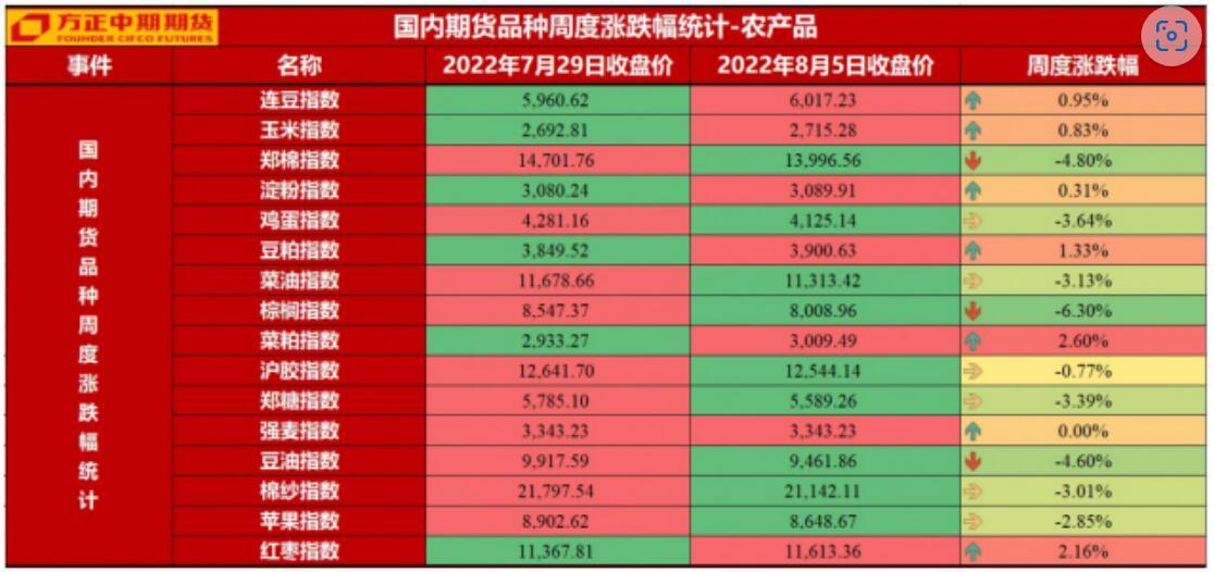 生鲜软商品板块:本周生鲜果品继续震荡整理走势,苹果表现略弱,红枣表现略强。苹果基本面情况来看,消费淡季与早熟苹果高开的博弈继续,期价呈现窄幅震荡走势;红枣市场来看,仓单压力与成本支撑博弈继续,期价窄幅震荡。后期来看,苹果以及红枣基本面突出因素有限,整体期价或继续区间震荡波动。