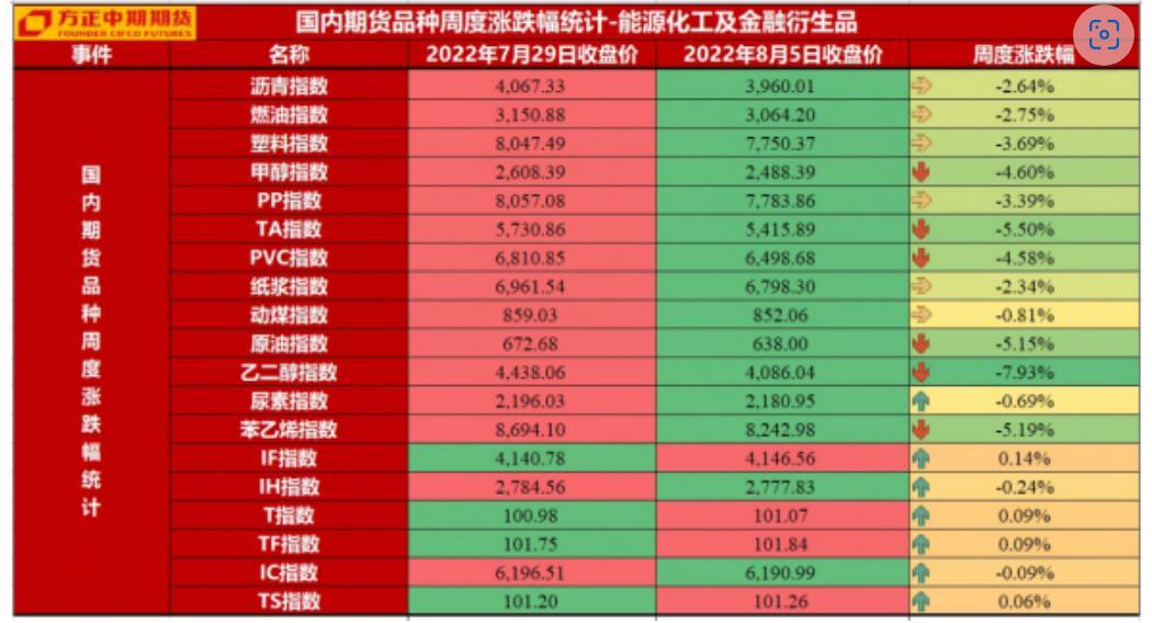 石油化工板块:本周,石油化工板块以下跌为主,美联储货币政策继续影响市场,经济衰退预期继续存在,同时已影响到原油现实需求,EIA公布数据显示,原油以及汽油库存均呈累库局面,原油以及相关油品价格压力重重,其中低硫燃料油跌幅最为明显,达11.20%,沥青市场受益于现货市场供应偏紧,周度与原油市场走势背离,呈窄幅整理走势;展望下周,预计石油化工板块继续受到此前逻辑驱动影响,价格可能继续呈现易跌难涨的局面,其中沥青走势可能相对偏强,建议进行多沥青盘面利润操作,而低高硫燃料油预计继续跟随原油波动为主,中游化工品种,下周来看,供需总体变动不大,主要跟随成本端波动为主。