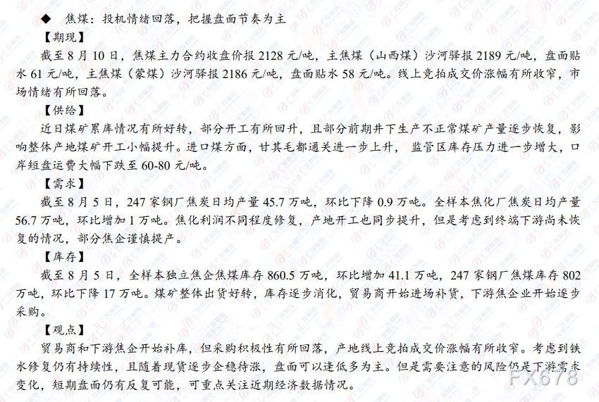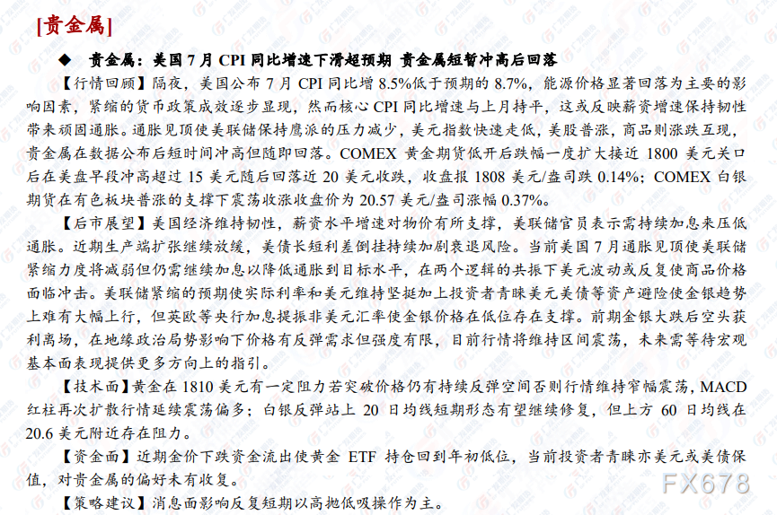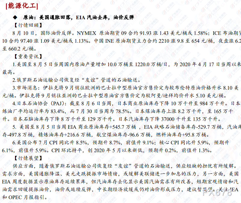8月11日,广发期货发布早知道,消息面影响反复,贵金属短期以高抛低吸操作为主。短期宏观情绪和汽油需求回暖提振油价,油价或延续反弹,中长期经济放缓或仍对油价形成压力,建议暂观望;关注 IEA和 OPEC 月报指引。