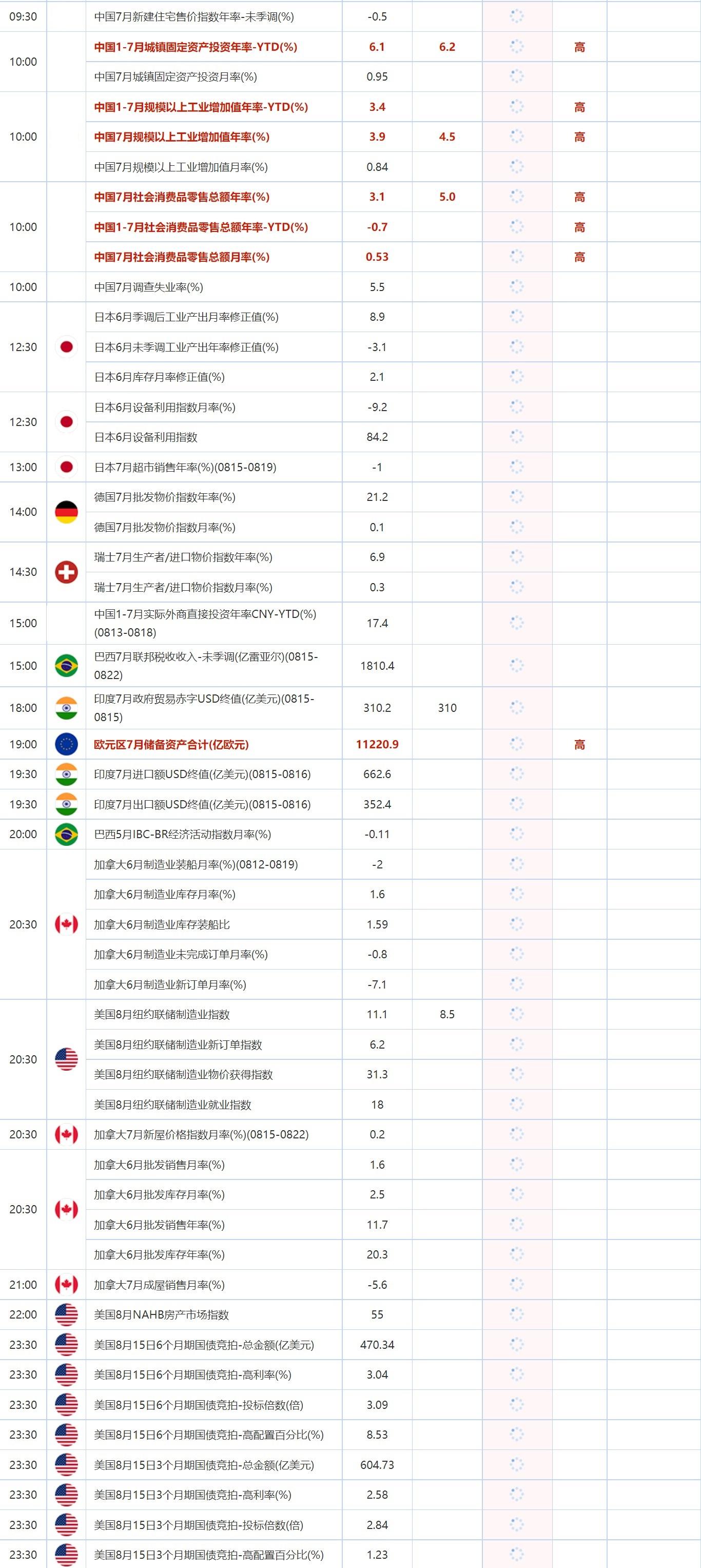 10:00 中国1-7月城镇固定资产投资年率-YTD(%) , 前值 6.1 , 预期值 6.2 , 公布值:待发布