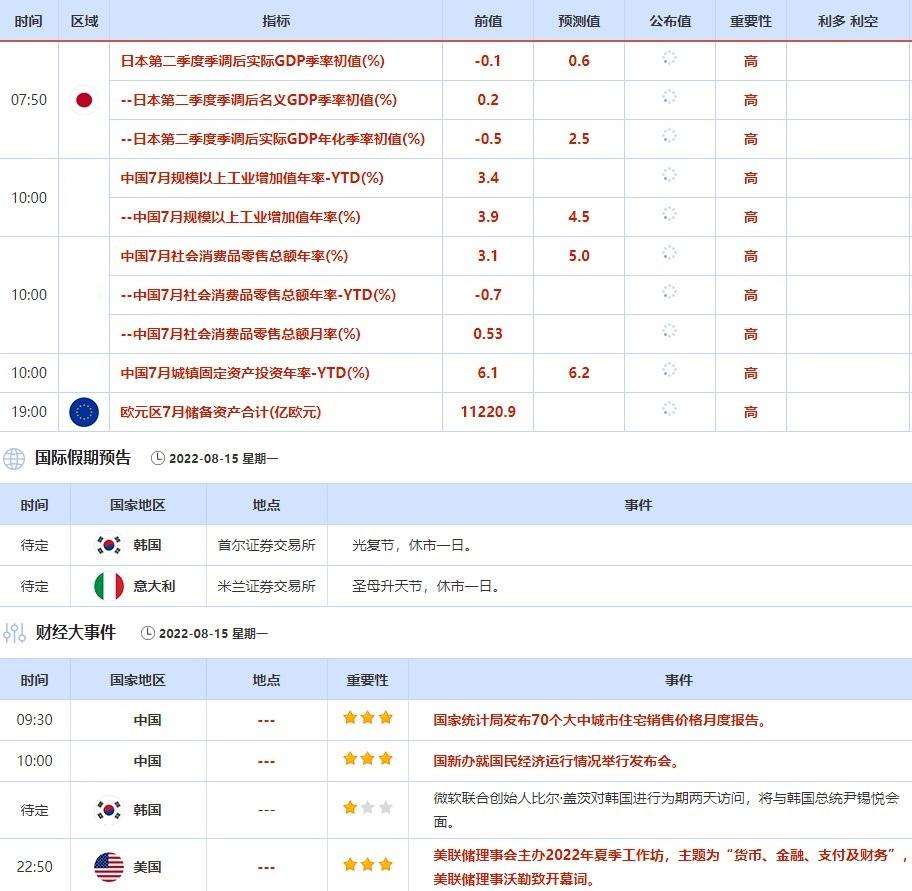 8月15日-8月19日当周,投资者需要关注的重点数据包括日本第二季度GDP、欧元区8月ZEW经济景气指数、英国7月CPI、美国7月零售销售、欧元区7月调和CPI、美国截至8月13日当周初请失业金人数、日本7月全国CPI和英国7月季调后零售销售。当周投资者需关注的大事包括澳洲联储公布货币政策会议纪要、新西兰联储利率决议、以及美联储7月货币政策会议纪要。此外,当周美联储还需关注堪萨斯联储主席乔治,明尼阿波利斯联储主席卡什卡利等重要官员的讲话。