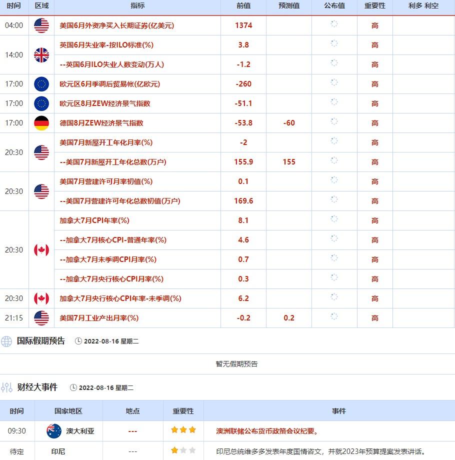 ②8月16日(周二)关键字:欧元区8月ZEW经济景气指数,美国7月工业产出,澳洲联储公布货币政策会议纪要