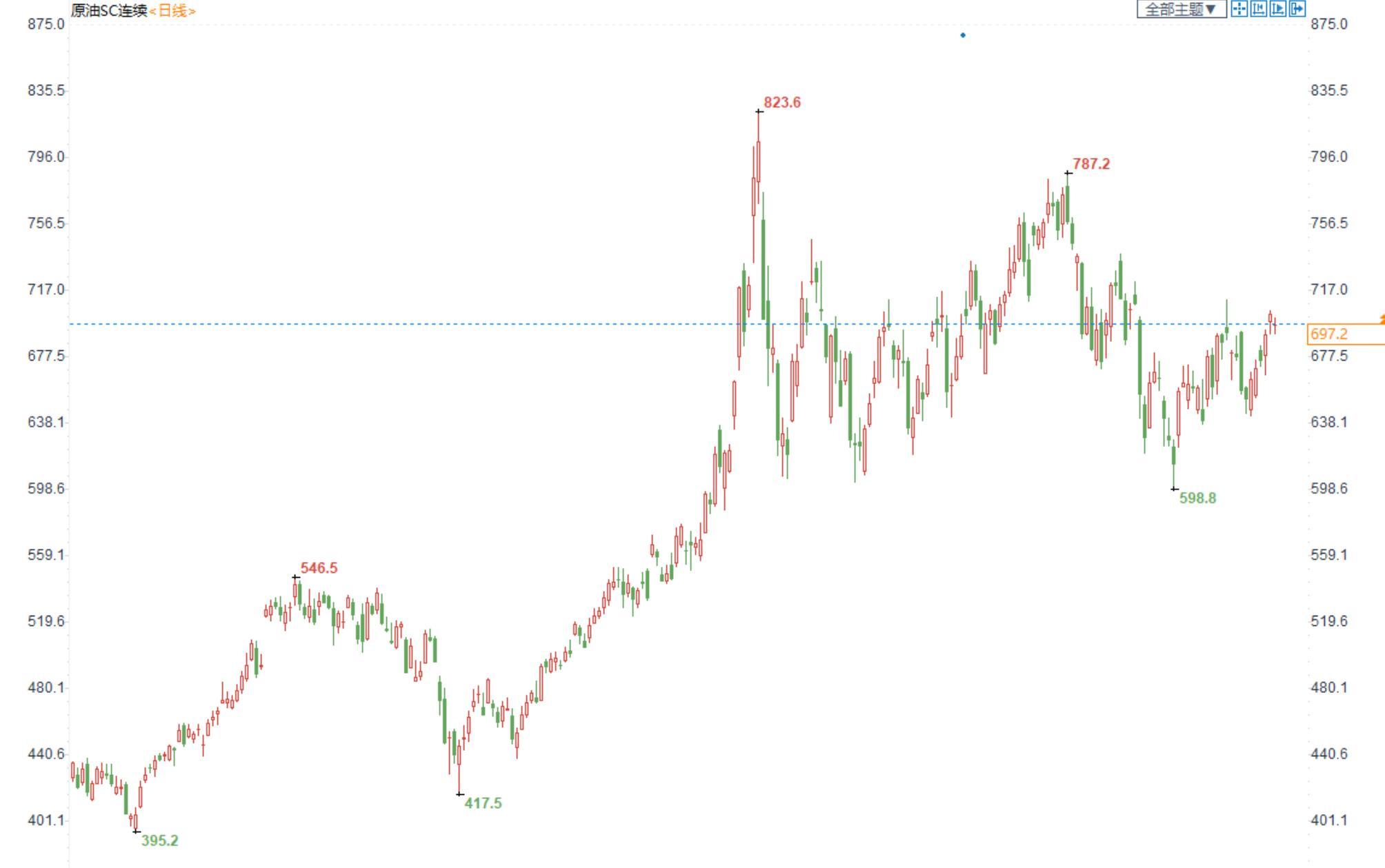 期货市场,布油小幅收跌,目前在93美元附近震荡整理,国内SC2209合约收盘价697.2,小幅收跌。
