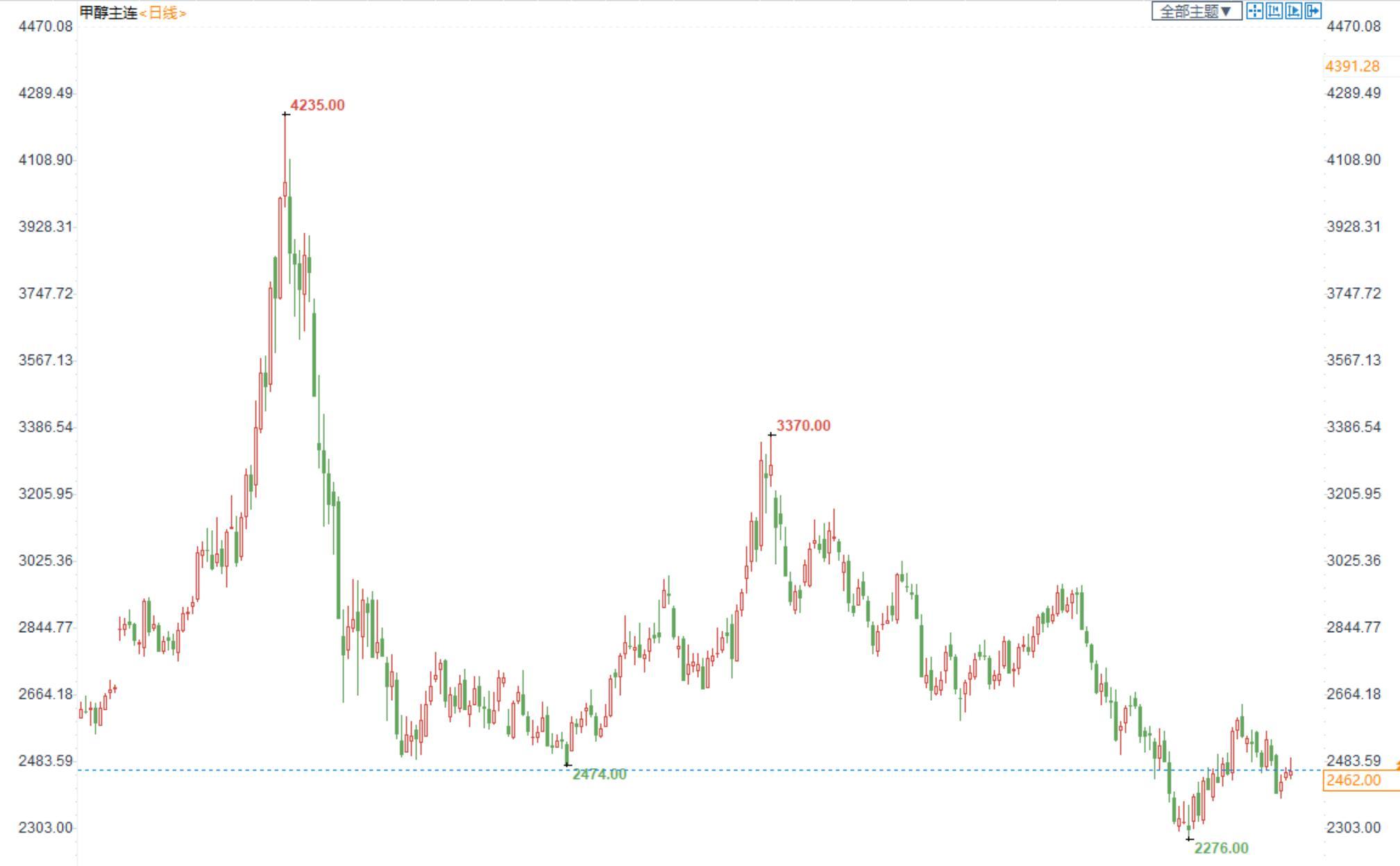 期货市场,甲醇2209合约小幅收涨,收盘价2462。江苏现货报价2480-2490,买气不佳。