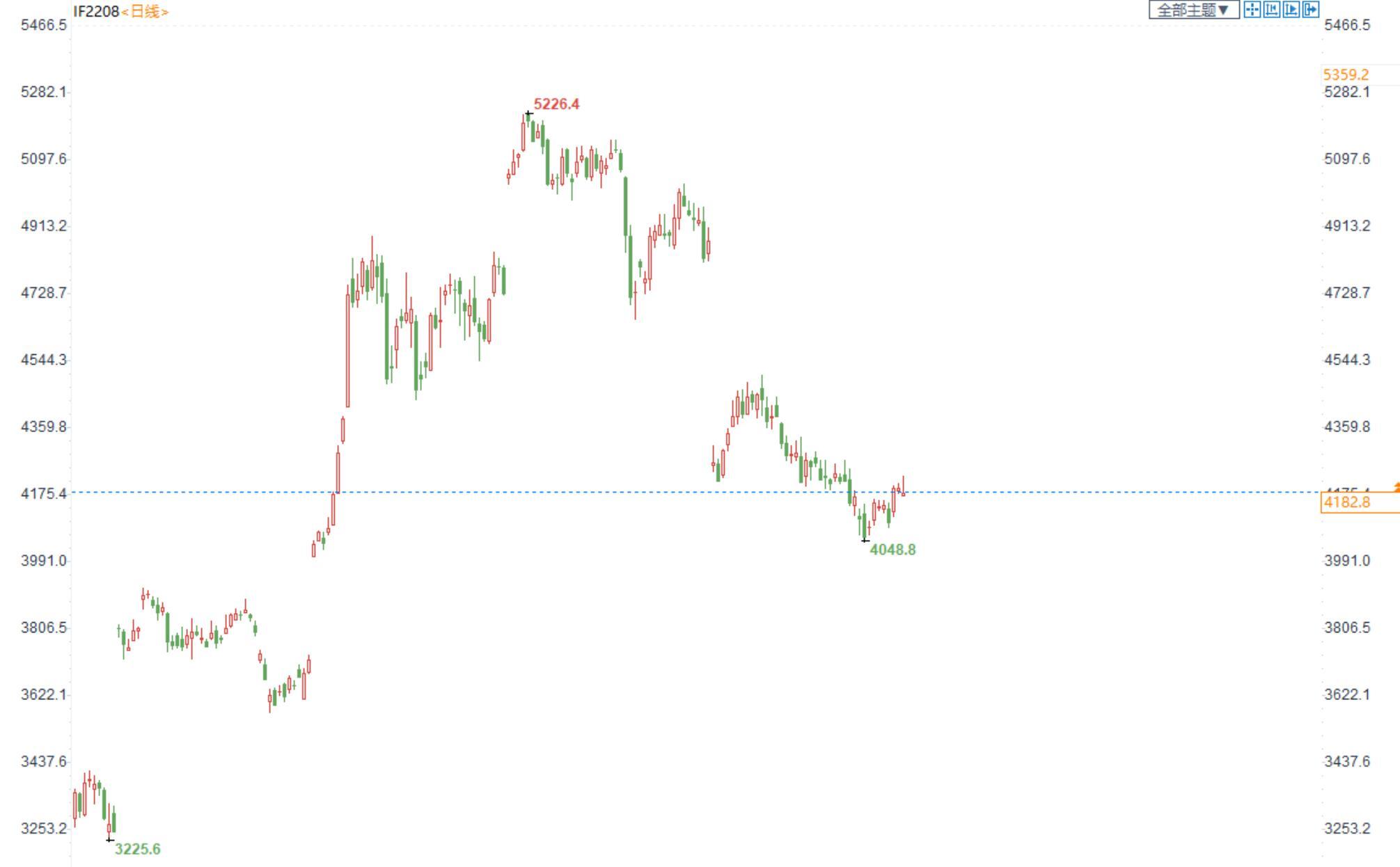 【今日行情】四大期指涨跌互现。IH2208收盘价为2782,收跌0.67%;IF2208收盘价为4182.8,收跌0.38%;IC2208收盘价为6429,收涨0.11%;IM2208收盘价为7266,收涨0.51%。今日指数延续大中小盘的分化,受上周五公布的社融数据表现较差影响,主要指数均跳空低开,随后受央行超预期降息和7月经济数据再度陷入泥潭影响,指数冲高回落,IH和IF均弱势震荡,IC和IM表现抗跌,小幅上扬。板块方面,新能源、有色金属以及煤炭涨幅居前,大金融和医药板块跌逾1%,两市个股涨跌近乎各半,总成交额降至9767亿元。不足万亿的成交额表明当前震荡行情下,资金交投热情并没有很高,没有量大盘想要突破前高很难。