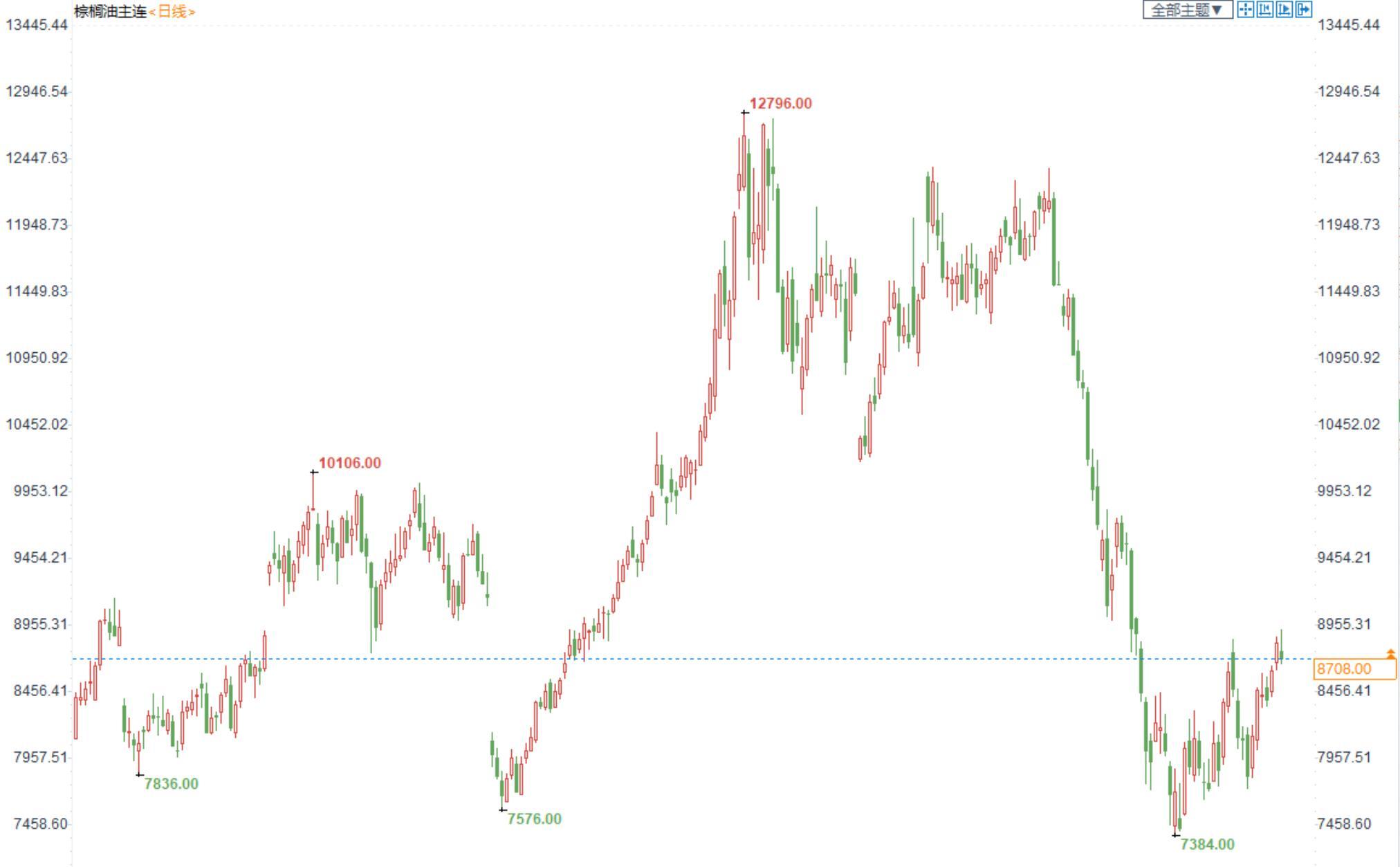 棕榈油2209合约日内跌1.38%,收盘8708元/吨;广州市场棕榈油10625元/吨。