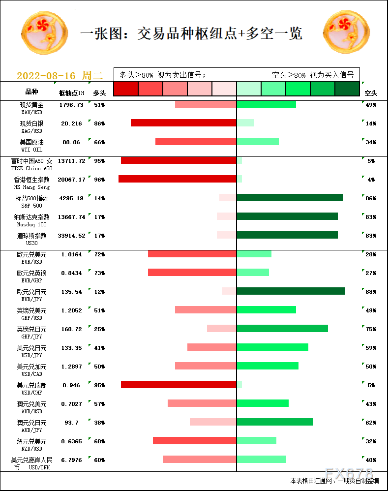 一张图:8月16日黄金白银、原油、股指、外汇“枢纽点+多空信号”;周二(8月16日)一张图看“枢纽点+多空信号”,品种包括:黄金、白银、原油、股指、欧元、英镑、日元、澳元、纽元、加元、富时中国A50、恒生指数、道指、标普500等。美元强势逆袭,金价“看跌吞没”,多头这下危险了!