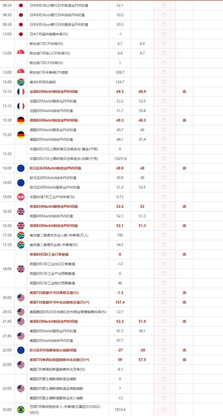 2022年8月23日,全球主要经济体将公布经济数据,需重点关注欧元区8月Markit制造业PMI初值,英国8月CBI工业订单差值,美国7月营建许可月率修正值,美国8月Markit制造业PMI初值,美国7月季调后新屋销售年化总数,欧元区8月消费者信心指数初值。大事方面需关注:8月24日(周三)07:00,明尼阿波利斯联储主席卡什卡利参与一场会议的问答环节。8月26日(周五)07:00开始的杰克逊霍尔全球央行年会。