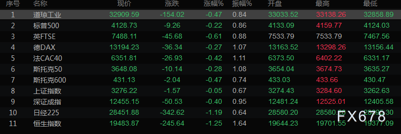 美股收盘情况,标普500指数下跌0.22%,收于4128.73点。纳斯达克指数持平于12381.30点,道琼斯工业平均指数下跌0.47%,至32909.59点。