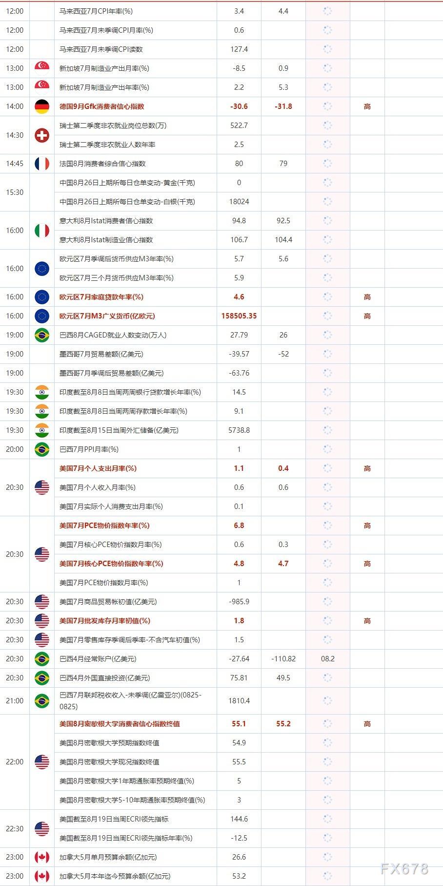 2022年8月26日,全球主要经济体将公布经济数据,需重点关注德国9月Gfk消费者信心指数,美国7月个人支出月率,美国7月PCE物价指数年率和美国7月批发库存月率初值。大事方面需关注:杰克逊霍尔全球央行年会举行,为期三天;美联储主席鲍威尔在杰克逊霍尔全球央行年会上发表讲话,可能就美国高昂的借贷成本和如何降低高通胀给出暗示。