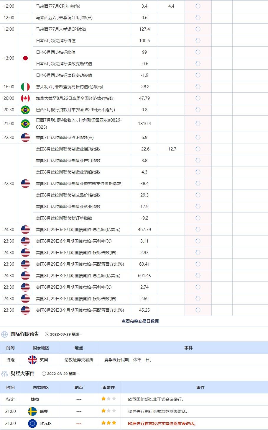 2022年8月29日,全球主要经济体将公布经济数据,需重点关注美国7月达拉斯联储PCE指数,美国8月达拉斯联储制造业活动指数。大事方面需关注:欧洲央行首席经济学家连恩发表讲话。此外,英国伦敦证券交易所8月29日因夏季银行假期,休市一日。