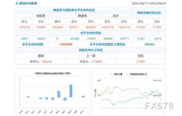 能源类持仓:截至8月23日当周,WTI原油期货投机性净多头寸24215手至179039手。NYMEX、ICE市场的天然气期货净空头寸减少12677手至6561手。据洲际交易所ICE数据显示,上周布伦特原油期货投机性净多头头寸增加29904至154358手;汽油期货投机性净多头头寸增加14897手至76467手。