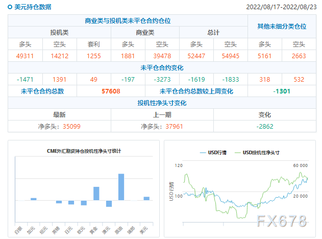 根据计算和美国商品期货交易委员会(CFTC)周五公布的数据,最近一周投机客持有的美元净多头押注有所增加。截至8月23日当周,美元净多头头寸从之前一周的133.7亿美元增至137.9亿美元。 芝加哥国际货币市场(International Moary Market)的美元仓位是根据日元、欧元、英镑、瑞郎、加元和澳元这六种主要货币的净仓位计算得出的。