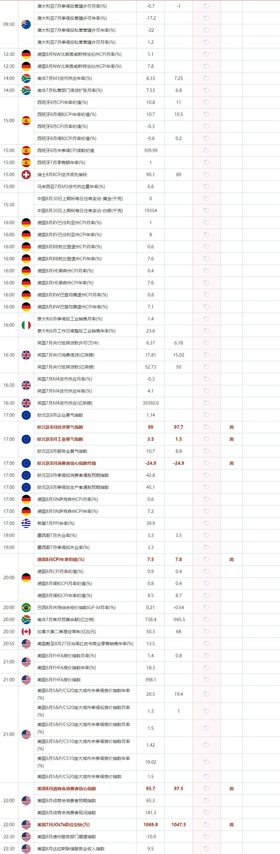 2022年8月30日,全球主要经济体将公布经济数据,需重点关注欧元区8月经济景气指数,欧元区8月消费者信心指数终值,德国8月CPI年率初值,美国7月JOLTs职位空缺,以及美国8月谘商会消费者信心指数。大事方面需关注:欧盟外长会议举行,至8月31日;里奇蒙德联储主席巴尔金就美国通胀和经济发表讲话,纽约联储主席威廉姆斯就美国经济前景发表讲话。