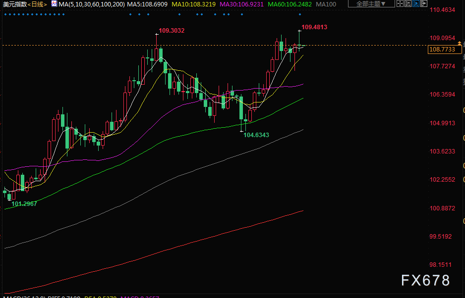 美元指数周一创下20年新高,受助于美联储主席鲍威尔的鹰派发言,但涨势受限,盘尾从高位回落,因欧洲央行加息预期增强提振欧元。美元指数盘初触及109.48,为2002年9月以来最高。