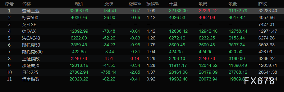 美股收盘情况:道琼斯工业指数下跌0.57%,至32098.99点;标普500指数下跌0.67%,至4030.61点;纳斯达克指数下跌1.02%,至12017.67。