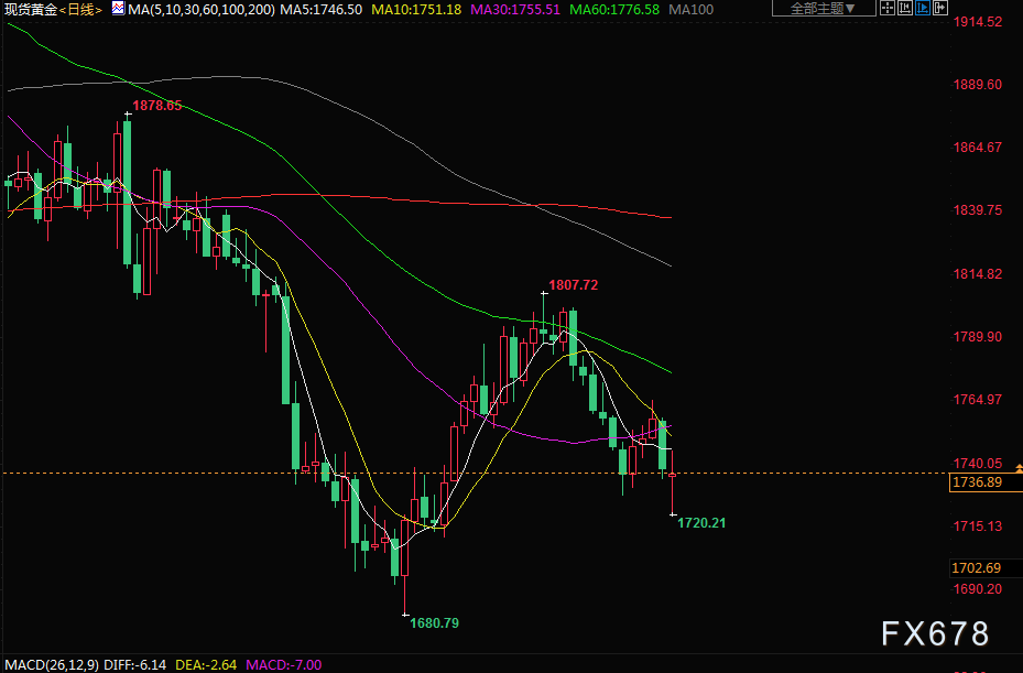 金价周一转跌为升,因美元涨势失去动能,盘中稍早,金价一度触及一个月最低,受累于美联储上周五暗示会继续大幅加息。