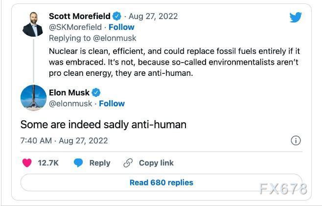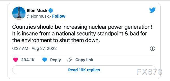 “各国应该增加核能发电,”马斯克在上周的推文中表示。“从国家安全的角度来看,关闭核电站是疯狂的,对环境有害。”