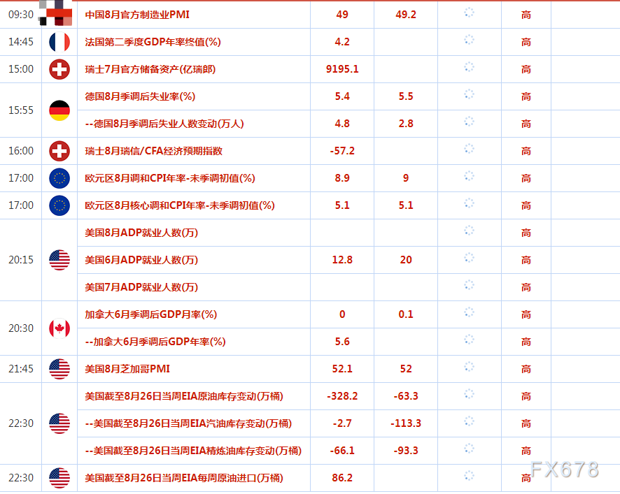 北京时间周三(8月31日)亚市早盘,美元指数交投于108.83附近;美元周二微涨,低于一天前创下的20年高点,而欧元则重新回到平价上方,因为市场对美联储和欧洲央行的超大规模加息预计进行了定价。金价下跌,投资者为美国和其他地区将在一段时间内处于高利率状态做准备;原油大跌近5%,创约一个月来最大跌幅,人们担心随着全球央行加息以对抗不断攀升的通胀,燃料需求可能疲软,而且伊拉克的动荡局势未能削弱该国的原油出口。