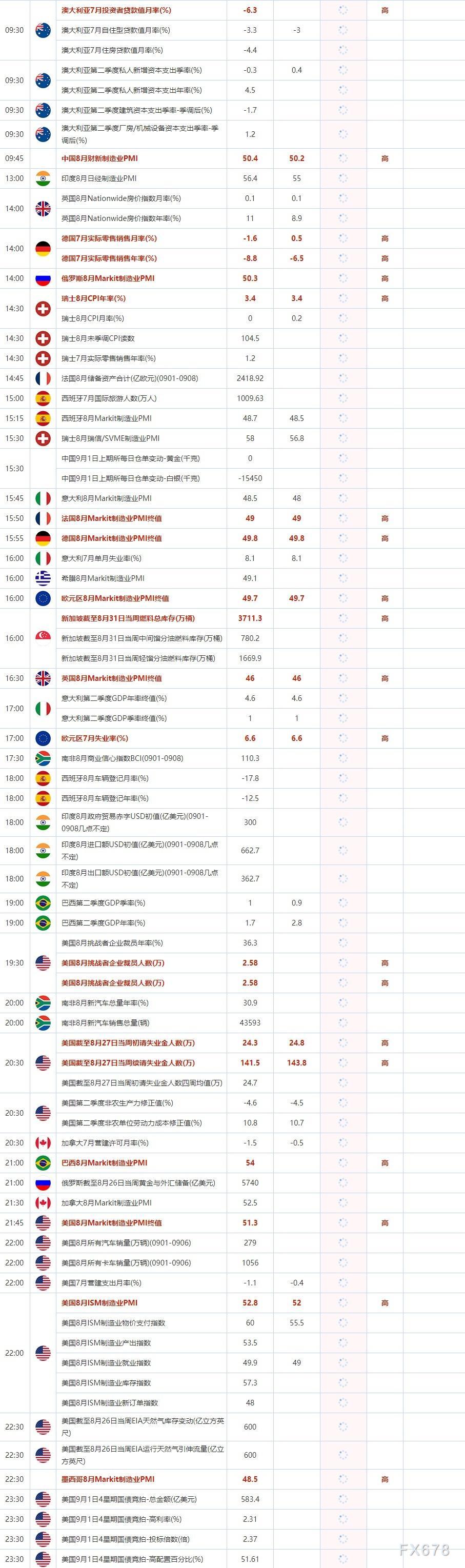 2022年9月1日,全球主要经济体将公布经济数据,需重点关注德国7月实际零售销售月率,法国、德国和欧元区8月Markit制造业PMI终值,欧元区7月失业率,美国截至8月27日当周初请失业金人数。大事方面需关注:美国财长耶伦会见英国财政大臣扎哈维,讨论俄罗斯石油价格上限问题。