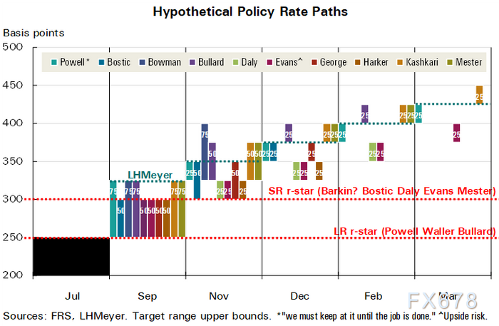 下面是一张美联储政策目标路径的假设图表, 是基于不同政策制定者对利率走向的可能预期