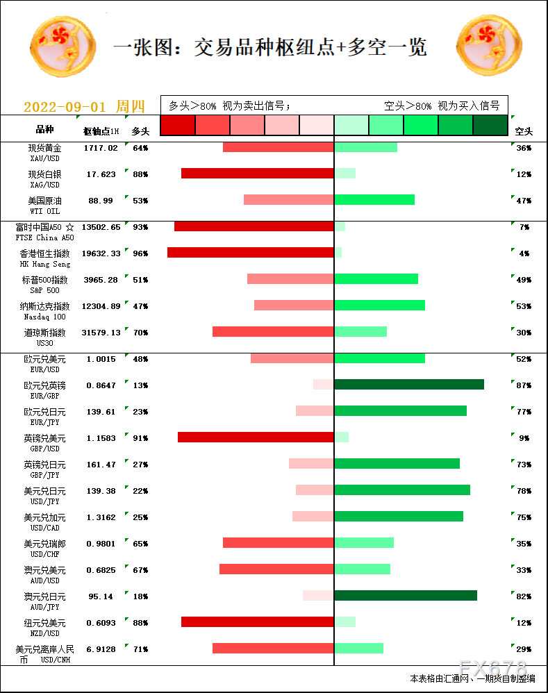 一张图:9月1日黄金白银、原油、股指、外汇“枢纽点+多空信号”;周四(9月1日)一张图看“枢纽点+多空信号”,品种包括:黄金、白银、原油、股指、欧元、英镑、日元、澳元、纽元、加元、富时中国A50、恒生指数、道指、标普500等。美元强势守在逾20年高点附近,加息预期高企,金价剑指1680?