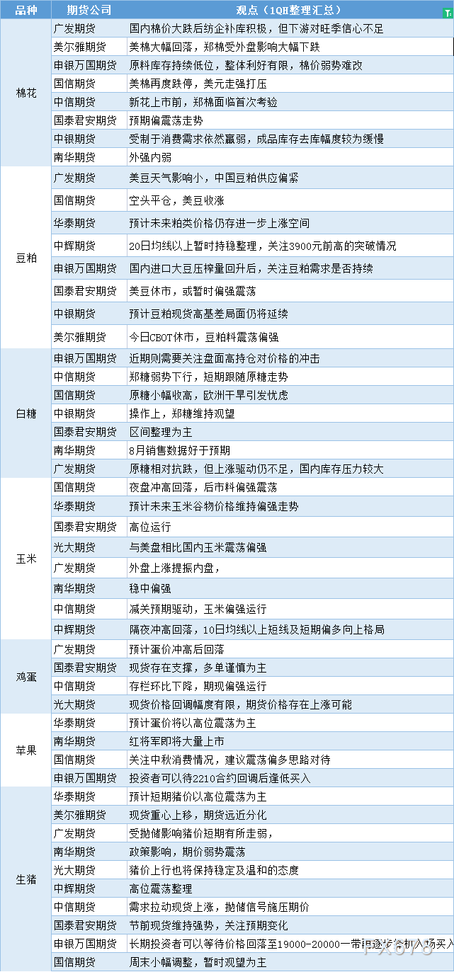 期货公司观点汇总一张图:9月5日农产品(棉花、豆粕、白糖、玉米、鸡蛋、生猪等)