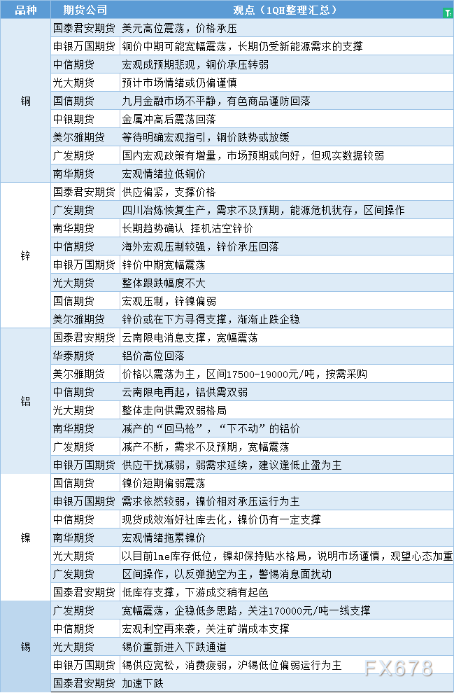 期货公司观点汇总一张图:9月5日有色系(铜、锌、铝、镍、锡等)