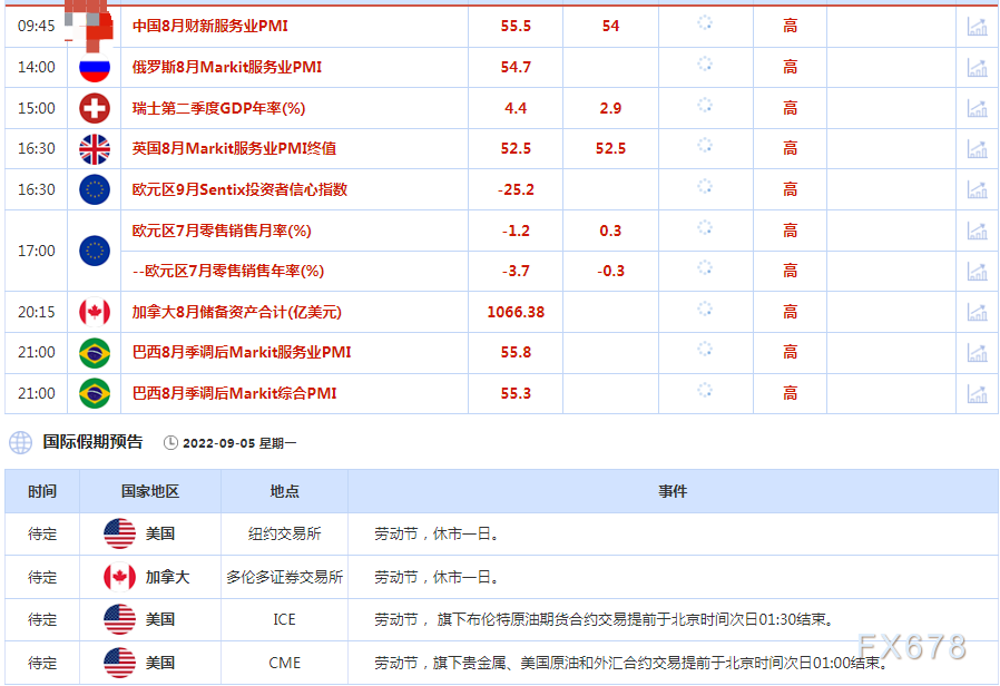 北京时间周一(9月5日)亚市早盘,美元指数交投于109.80附近;美元上周五从20年高点回落,此前数据显示,美国8月非农就业岗位增幅高于预期,但工资增长放缓,失业率走高,这给美联储本月晚些时候加息时提供了一些回旋余地;金价反弹近1%;油价上涨,因预期OPEC+联盟将在9月5日的会议上讨论减产,不过对全球经济疲软的担忧仍笼罩着市场;但俄罗斯周六已经取消了恢复北溪一号管道天然气输气的最后期限,且欧盟加大对俄制裁,油价本周或受相关消息影响获得提振。