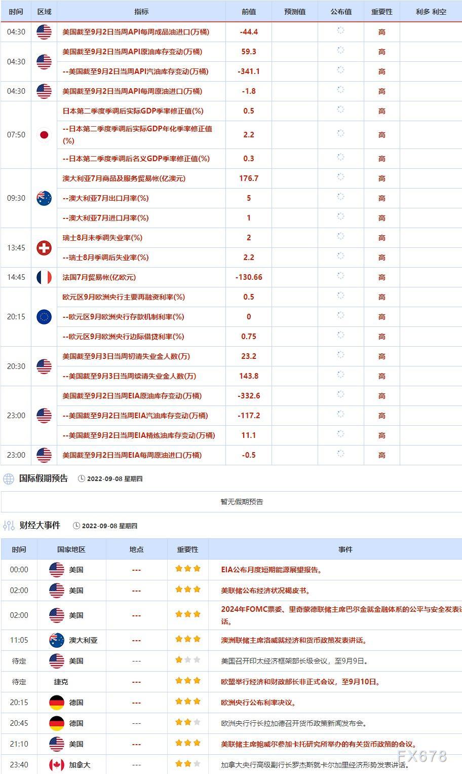 ④9月8日(周四)关键字:美国截至9月2日当周API和EIA原油库存变动, 美国截至9月3日当周初请失业金人数,欧洲央行利率决议