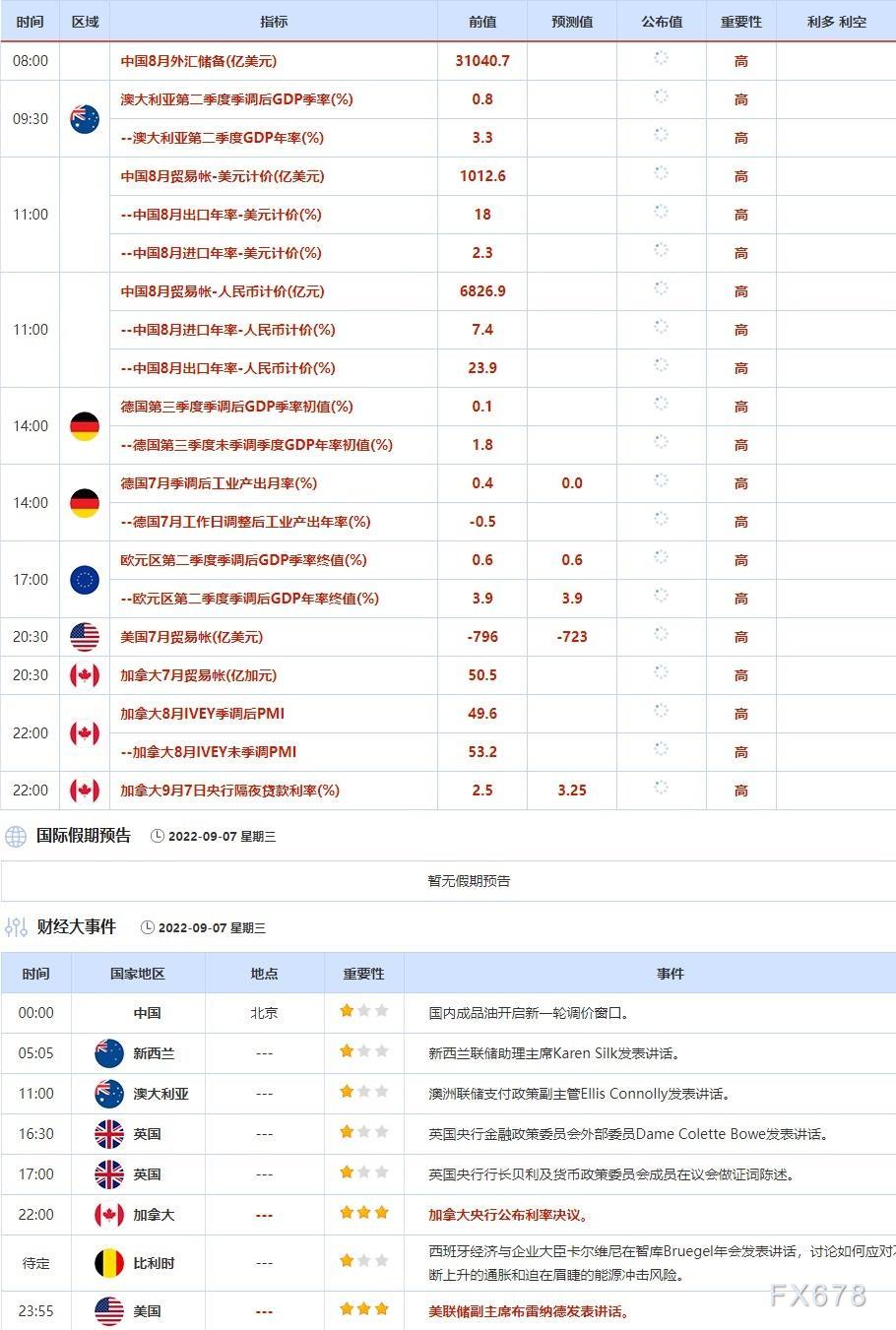 9月7日晚些时候,投资者需关注加拿大央行利率决议。加拿大帝国商业银行(CIBC)预测,预计加拿大央行在9月7日加息75个基点之后,可能会暂停加息。