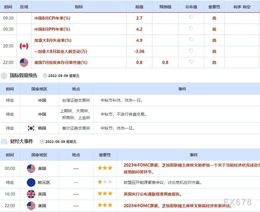 ⑤9月9日(周五)关键字:加拿大8月失业率和就业人数变动,中秋节休市,芝加哥联储主席埃文斯