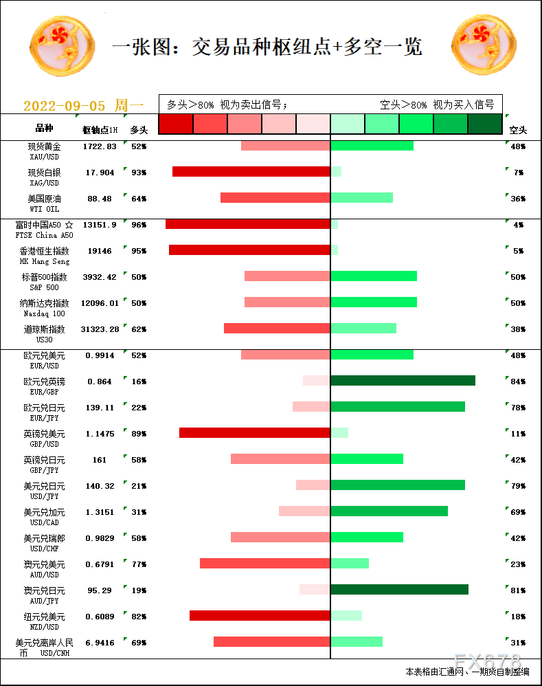 一张图:9月5日黄金白银、原油、股指、外汇“枢纽点+多空信号”;周一(9月5日)一张图看“枢纽点+多空信号”,品种包括:黄金、白银、原油、股指、欧元、英镑、日元、澳元、纽元、加元、富时中国A50、恒生指数、道指、标普500等。美联储加息75个基点的预期降温,欧洲遭遇能源危机!多头继续反攻?