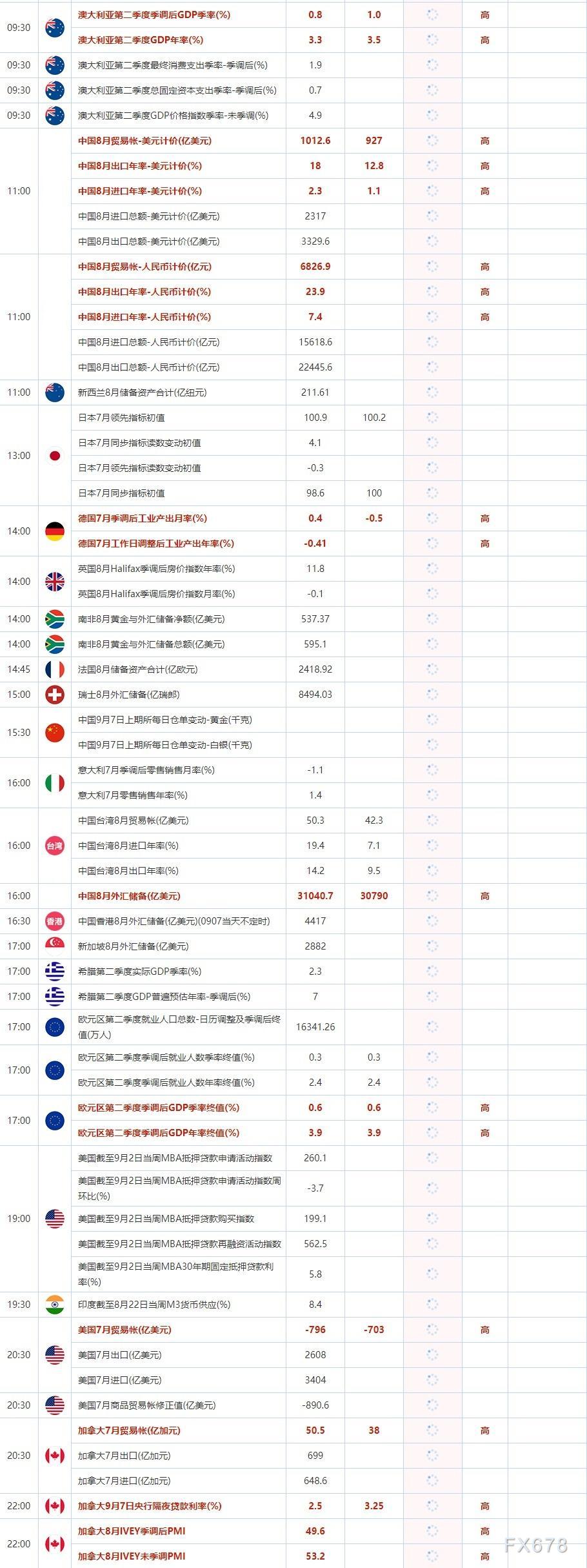 2022年9月7日,全球主要经济体将公布经济数据,需重点关注澳大利亚第二季度季调后GDP季率,德国7月季调后工业产出月率,中国8月外汇储备,欧元区第二季度季调后GDP季率终值,美国和加拿大7月贸易帐。大事方面需关注:英国央行行长贝利及货币政策委员会成员在议会做证词陈述,里奇蒙德联储主席巴尔金发表讲话,加拿大央行公布利率决议,克利夫兰联储主席梅斯特就美国经济和货币政策发表讲话。