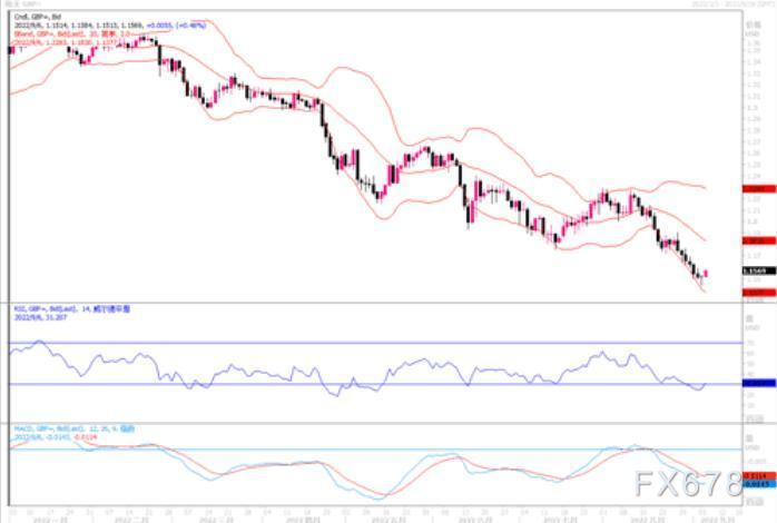 英镑兑美元周一(9月5日)在两年半低点附近徘徊。特拉斯在保守党领导人竞选中获胜,将成为英国下一任首相。特斯拉实施新政的第一步提出减税并正在考虑抵消能源支出上升的支持措施,这些措施可能会进一步增加通胀上行的压力,并扩大预算赤字。对英镑而言,更宽松的财政政策可能会带来短期的提振。然而,已经捉襟见肘的公共财政将更加不稳定,这将可能会让潜在的买家望而却步。日图受下行均线打压不断刷新低点,仍维持弱势。4小时图均自低位产生反弹,目前已穿越了20周期均线,技术指标自超卖区域出现拐头,显示短线有超卖回补的反弹整理趋势,若能进一步反弹穿过1.16,则前方的阻力位置在1.1740附近。