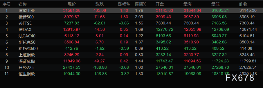 美股收盘情况:道琼斯工业指数上涨1.4%,至31581.28点;标普500指数上涨1.83%,至3,979.87点;纳斯达克指数上涨2.14%,至11791.90点。